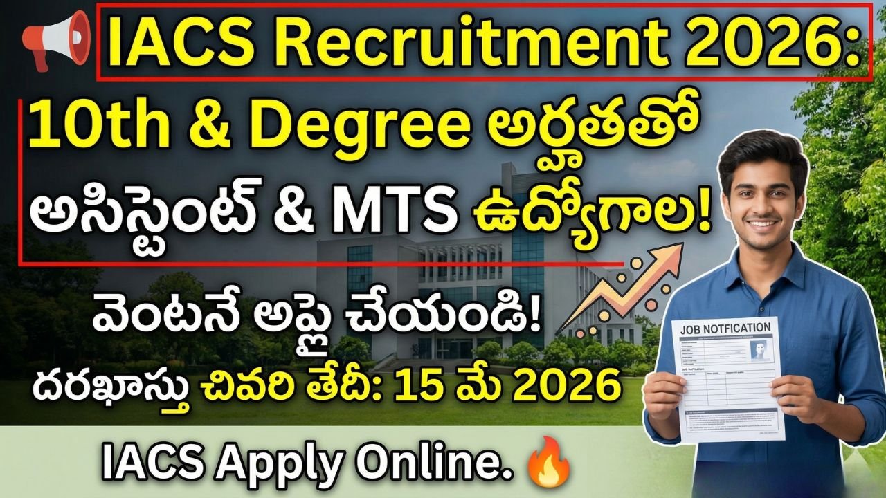 10th & Degree అర్హతతో Assistant మరియు MTS ఉద్యోగాలకు అప్లై చేసే అవకాశం. చివరి తేదీ 15 మే 2026. వెంటనే దరఖాస్తు చేయండి. IACS Recruitment 2026